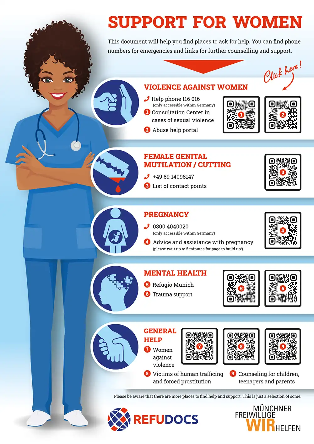 REFUDOCS e.V. hat sich zur Aufgabe gemacht, Schutzsuchenden beim Weg zur adäquaten Gesundheit zu helfen. Der Zugang zum medizinischen Versorgungssystem in Deutschland ist für diese Menschen in vielerlei Hinsicht erschwert. Hier setzen die REFUDOCS an, indem sie niederschwellige medizinische Basisversorgung anbieten, relevante Barrieren beseitigen und bei Bedarf lokale Angebote und Institutionen entlasten. Im Zuge dessen konnte beispielsweise ein englischsprachiges Infoblatt zum Thema Frauengesundheit erarbeitet werden, auf dem Anlaufstellen und Infos zu z.B. Gewalt, Schwangerschaft, mentaler Gesundheit und weitere Themen in QR-Codes zusammengestellt sind,